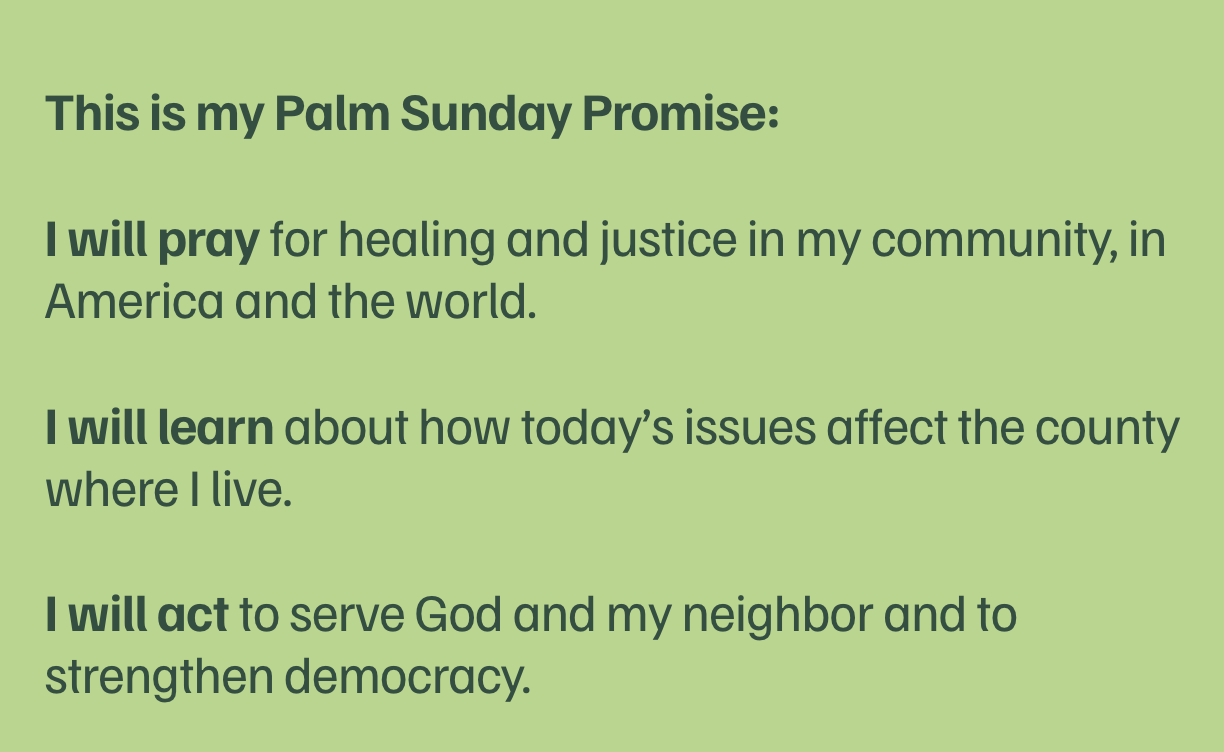 And just like Jesus, those who make a Palm Sunday Promise will pray, learn and act. We promise to work to create a country where the hungry are fed, strangers are welcomed, and the sick are healed. These are Christian values.